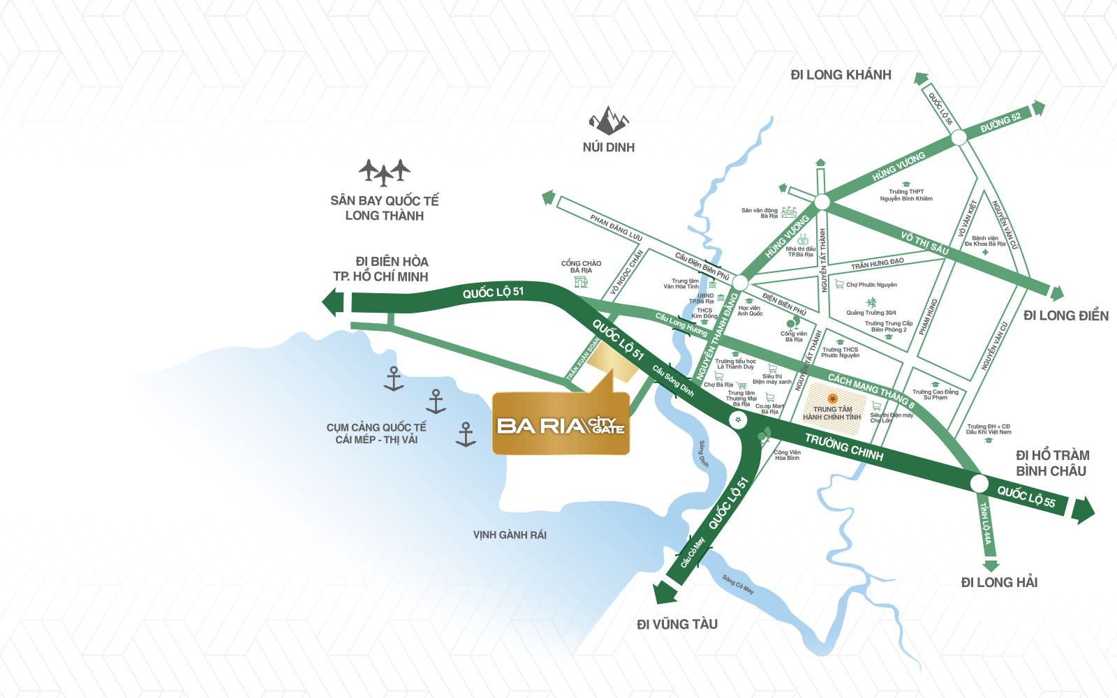 - Dự án Bà Rịa City Gate nằm ngay mặt tiền Quốc Lộ 51, cửa ngõ vào Trung Tâm Hành Chính – Chính Trị của tỉnh Bà Rịa – Vũng Tàu. Cách Thành Phố Biển Vũng Tàu khoảng 15km.