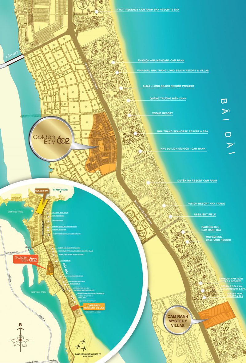 Khu đô thị Goden Bay 1 tọa lạc mặt tiền Đại lộ Nguyễn Tất Thành, tuyến đường huyết mạch kết nối Sân Bay QT Cam Ranh và TP Nha Trang. Bên cạnhcạnh quần thể Resort đẳng cấp như Resort Park Hyatt, Ocean Window, Mia Resort, Diamond Bay, Sân Golf Cù Hin…Biển Bãi Dài được bầu chọn là một trong những Bãi Biển đẹp nhất thế giới. Từ dự án Golden Bay vào TP Nha Trang chỉ 30 phút và 10 phút đến Sân Bay QT Cam Ranh.