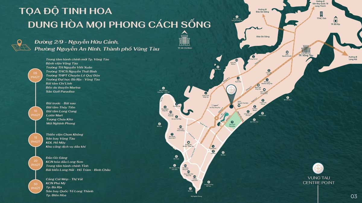 Vung Tau Centre Point là một phân khu thuôc quy hoạch chung của Khu Đô Thị Chí Linh. Vung Tau Centre Point sở hữu 2 mặt tiền 2 tháng 9 (QL 51B) và đường Nguyễn Hữu Cảnh. Với vị trí đắt địa, thuận lợi di chuyển ra biển Chí Linh, Long Cung Resort, Bãi trước, Bãi sau..Kết nối với những tiện ích ngoại khu xung quanh Vũng Tàu chỉ 5 phút đi xe.