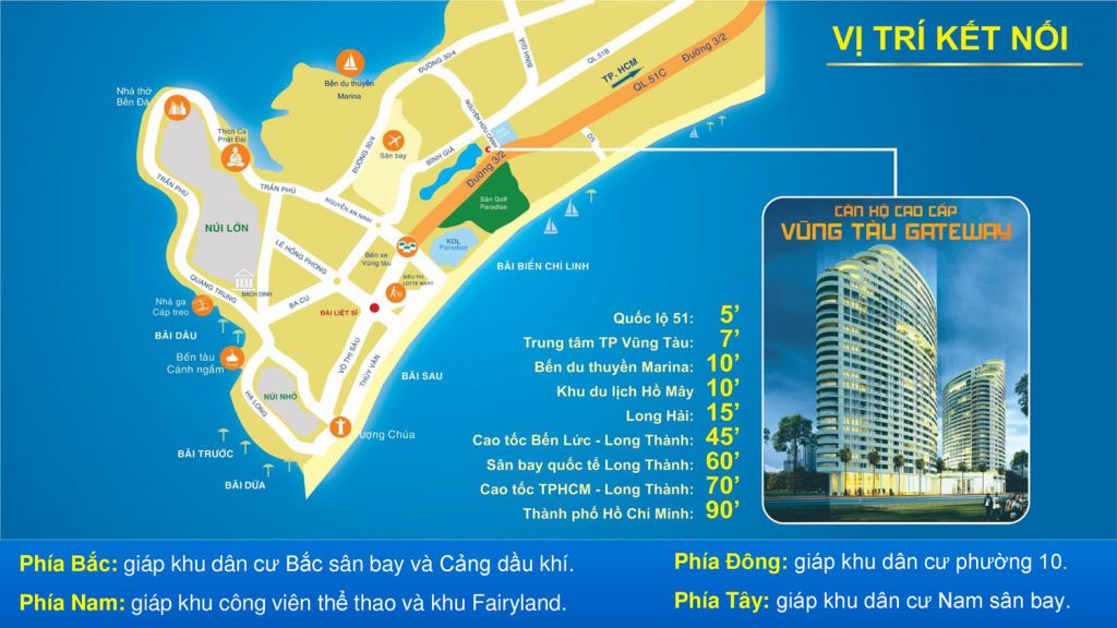 - Nằm trên trục đường Quốc lộ 3/2, cư dân Vũng Tàu Gateway chỉ mất 10 phút di chuyển đến Trung tâm thành phố và các danh lam thắng cảnh, khu du lịch sinh thái, nhà hàng ẩm thực nổi tiếng và các bãi biển thơ mộng.