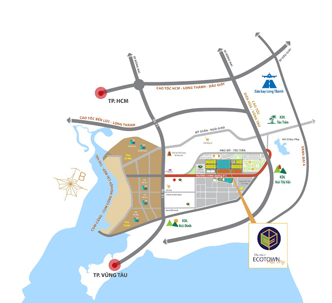 Vị Trí Chiến Lược – Kết Nối Giao ThươngEcotown Phú Mỹ toạ lạc ngay mặt tiền đường Trường Chinh – trục đường trung tâm sầm uất nhất thị xã Phú Mỹ. Dự án nằm giữa 3 trục đường giao thương chiến lược: Trường Chinh, Phú Mỹ – Tóc Tiên và cao tốc Biên Hoà – Vũng Tàu. Với hệ thống giao thông kết nối phát triển nhanh chóng, từ Ecotown Phú Mỹ cư dân dễ dàng di chuyển đến trung tâm TP HCM chưa đầy 60 phút thông qua Quốc Lộ 51 và tuyến cao tốc Tp.HCM – Long Thành – Dầu Giây, đi về trung tâm Biên Hoà – Đồng Nai chỉ 20 phút khi cao tốc Biên Hoà – Vũng Tàu đi vào hoạt động, đến trung tâm Tp.Vũng Tàu chỉ 30 phút.